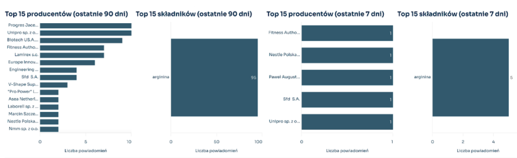 W ciągu ostatnich 90 dni do rejestru GIS zgłoszono aż 96 nowych produktów z argininą (co przedstawiono na wykresie 1). Równo po 10 zgłoszeń, i tym samym najwięcej, pochodziło od producentów: Progres Jacek Kujko i Wspólnicy oraz Unipro. Tuż za nimi uplasowała się firma Biotech S.A. Polska z liczbą 9 zgłoszeń. Po 7 zgłoszeń miały Fitness Authority i Lamirex. Tylko w ostatnim tygodniu unikalnych notyfikacji do GIS wpłynęło aż 5!