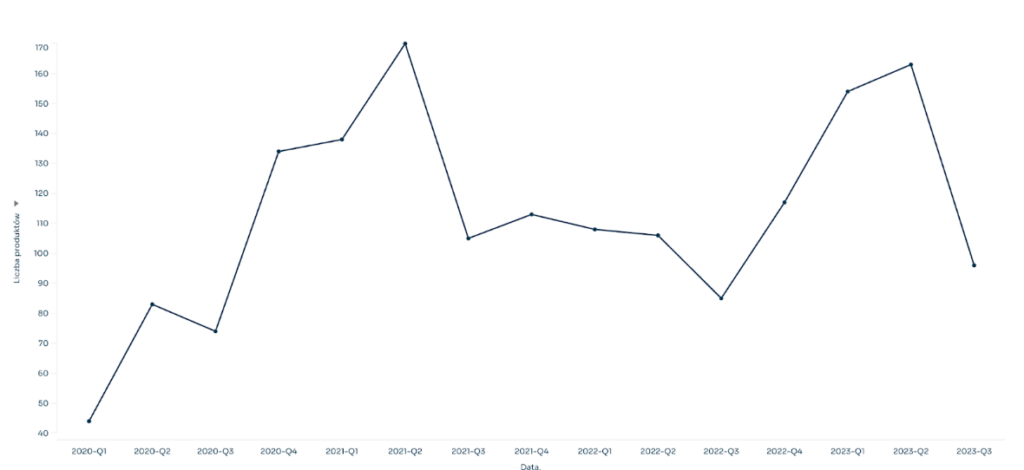Jak sytuacja kształtowała się w poprzednich latach? W 2020 roku liczba notyfikacji o preparatach z argininą wyniosła 335 (wykres 2). W 2021 roku padł absolutny rekord. “Boom” na argininę zaowocował aż 526 zgłoszeniami. W 2022 liczba ta również była imponująca – 416 zgłoszeń. Jak dane te wyglądają w perspektywie 2023 roku? Tylko w tym roku do GIS wpłynęło aż 413 notyfikacji dotyczących preparatów z argininą, w sumie od 84 producentów.