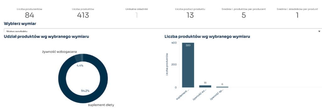 Na podstawie wykresu 3 można stwierdzić, że zdecydowana większość, bo aż 94% z nich miało status suplementu diety, 5,2% – żywności wzbogaconej, 1,1% – żywności specjalnego przeznaczenia medycznego.