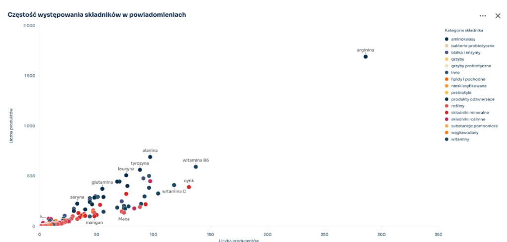 Analiza wskazuje na rosnącą popularność argininy jako składnika suplementów z uwagi na korzyści dla zdrowia układu krążenia i wzrostu mięśni. Rejestr GIS odnotowuje więcej produktów z argininą, głównie sprzedawanych w sklepach ze zdrową żywnością i odżywkami dla sportowców.
