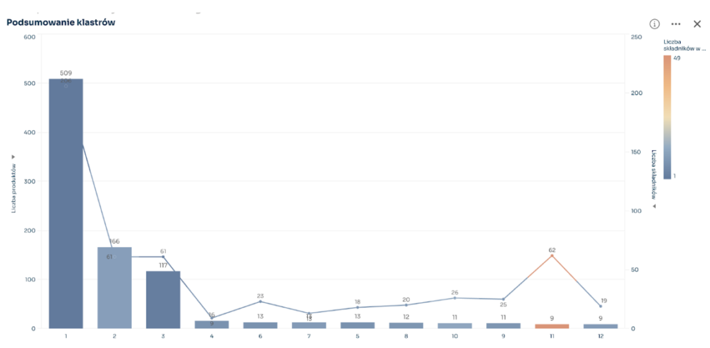- Produkty układają się w 72 klastry (grupa produktów wykazujących do siebie podobieństwo pod kątem składu), z czego w 3 pierwszych znajduje się 792 produktów. Jest to w zasadzie realizacja prawa Pareto.