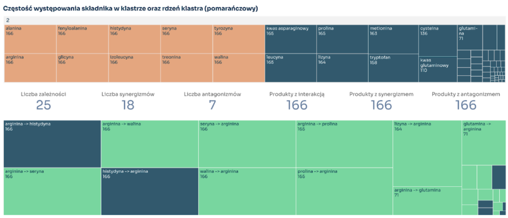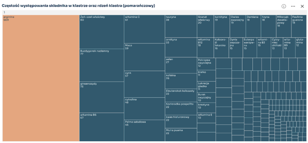 - W klastrze 1, arginina występuje raczej w pojedynkę. Jeśli w towarzystwie, to ok. 6-krotnie rzadziej z żeń-szeniem właściwym, buzdygankiem naziemnym, witaminą B6 czy C (wykres 6).
